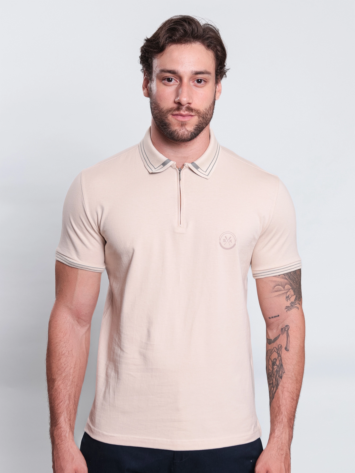 POLO CASUAL EM MALHÃO C/ ZÍPER, SILK NO TOM E FILETE CONTRASTANTE