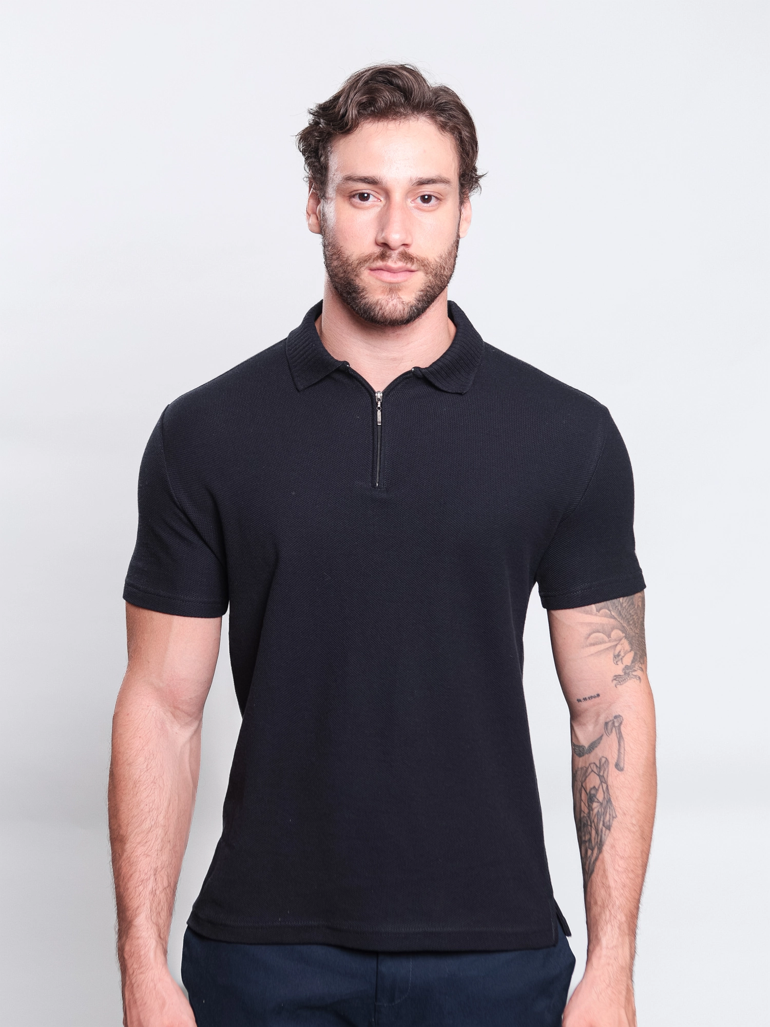POLO CASUAL EM MALHA COLMEIA C/ ZIPER E GOLA TEXTURIZADA