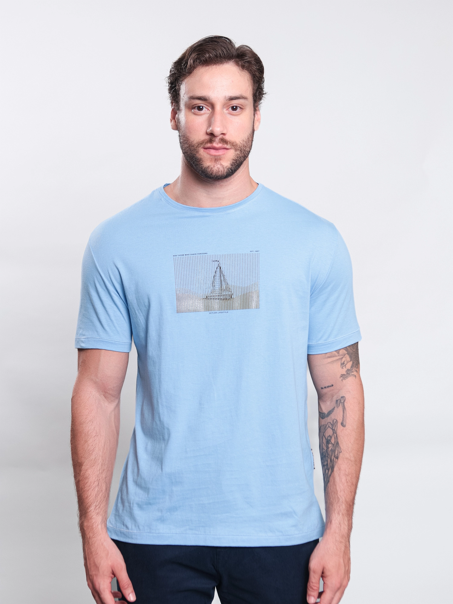 T-SHIRT CASUAL C/ ESTAMPA BARCO E SILK GEL SOBREPOSTO