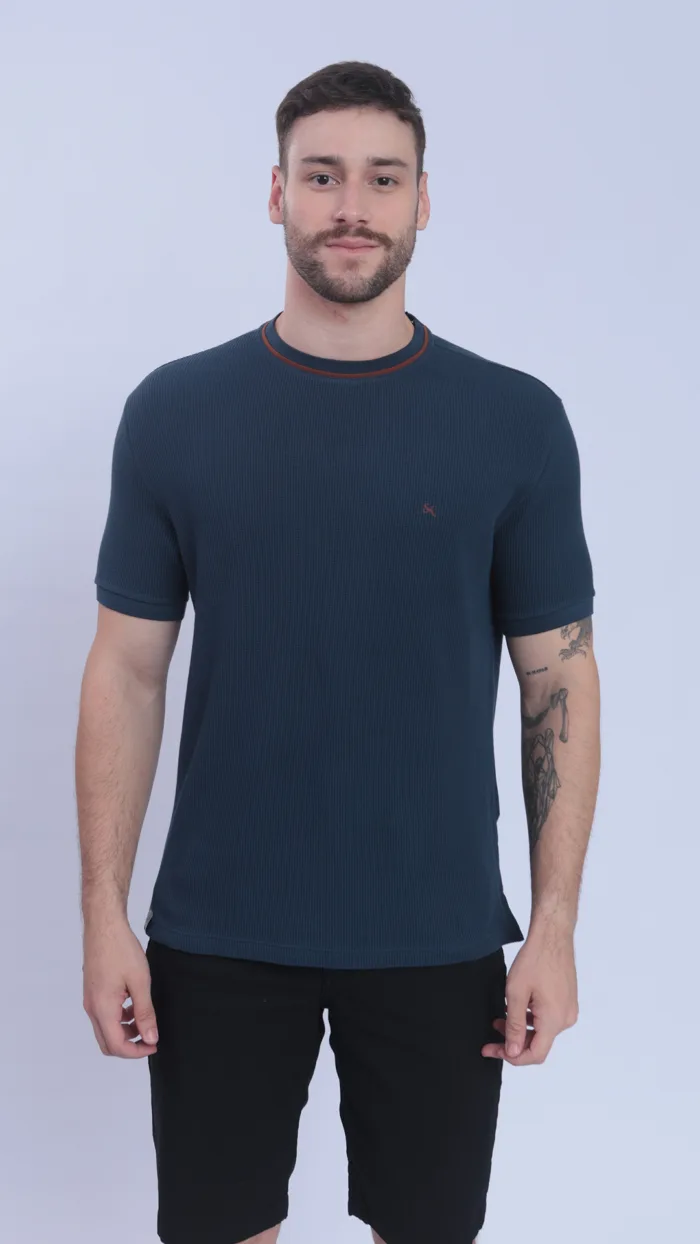T-SHIRT CASUAL EM MALHA QUADRICULADA E VIVO NA GOLA