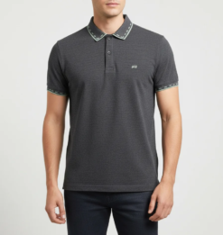 POLO CASUAL EM PIQUET PA C/ PEITILHO INTERNO CONTRASTANTE E RETILÍNEA TRACEJADA