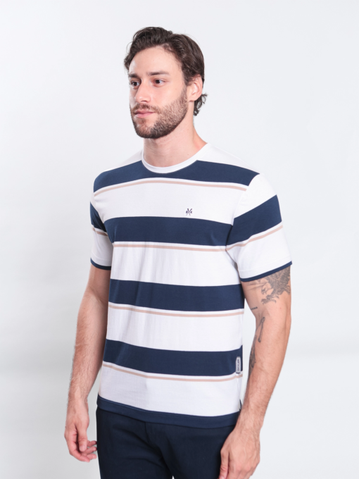 T-SHIRT CASUAL EM MALHA TEXTURIZADA LISTRADA C/ BORDADO NA MANGA