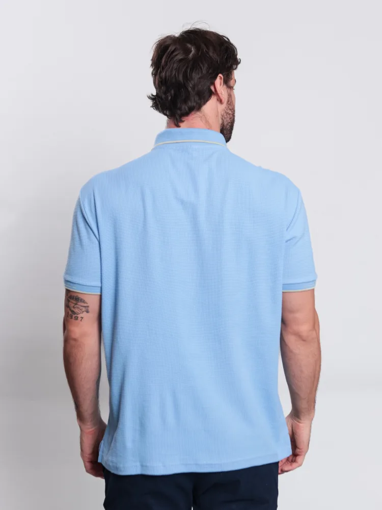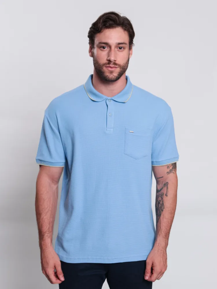POLO CASUAL EM MALHA TEXTURIZADA C/ BOLSO E PLAQUINHA