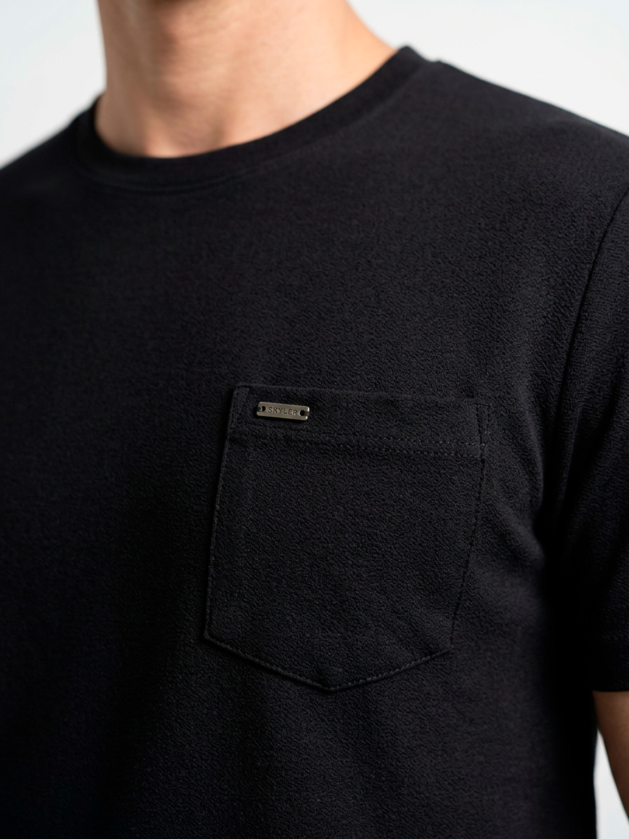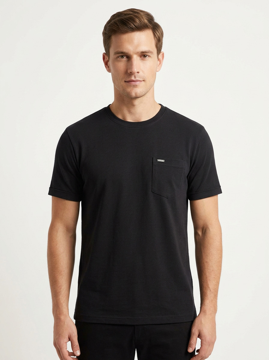T-SHIRT CASUAL EM MALHA CREPE C/ BOLSO E PLAQUINHA